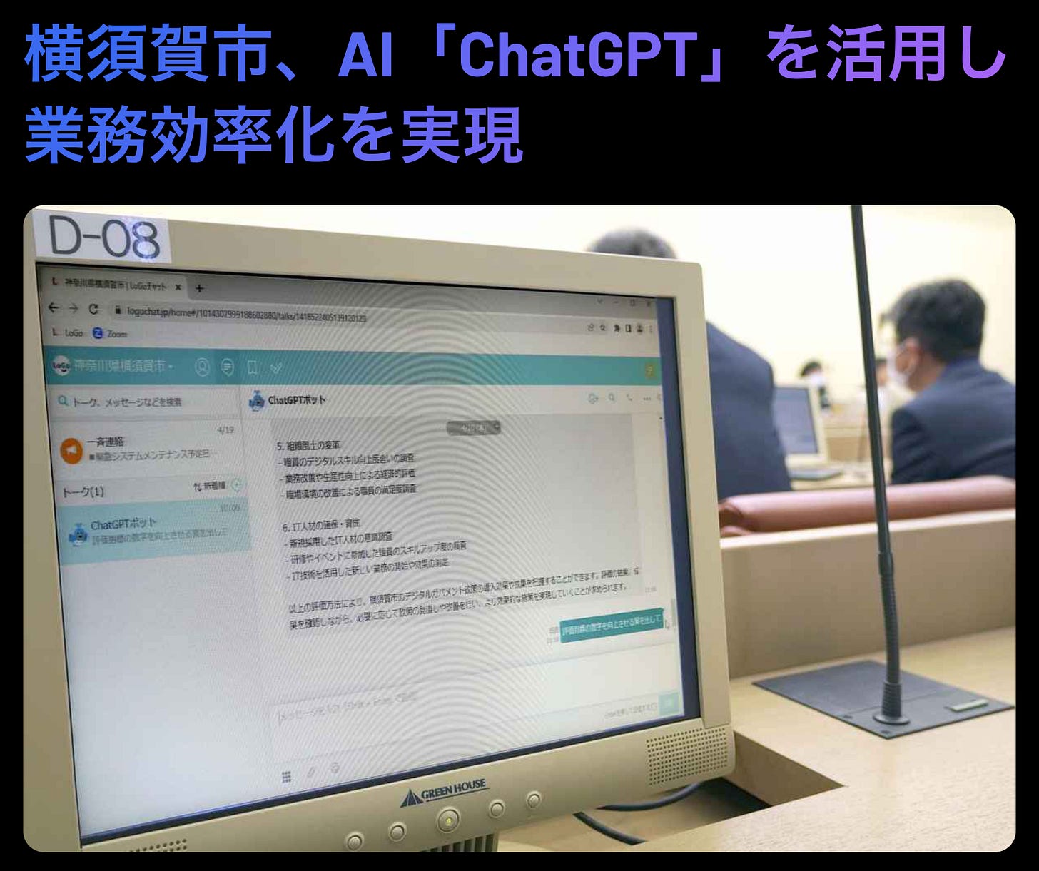 横須賀市がAI「ChatGPT」を試験導入、41日間で約2万6千件の活用、8割の職員が効率向上を実感。